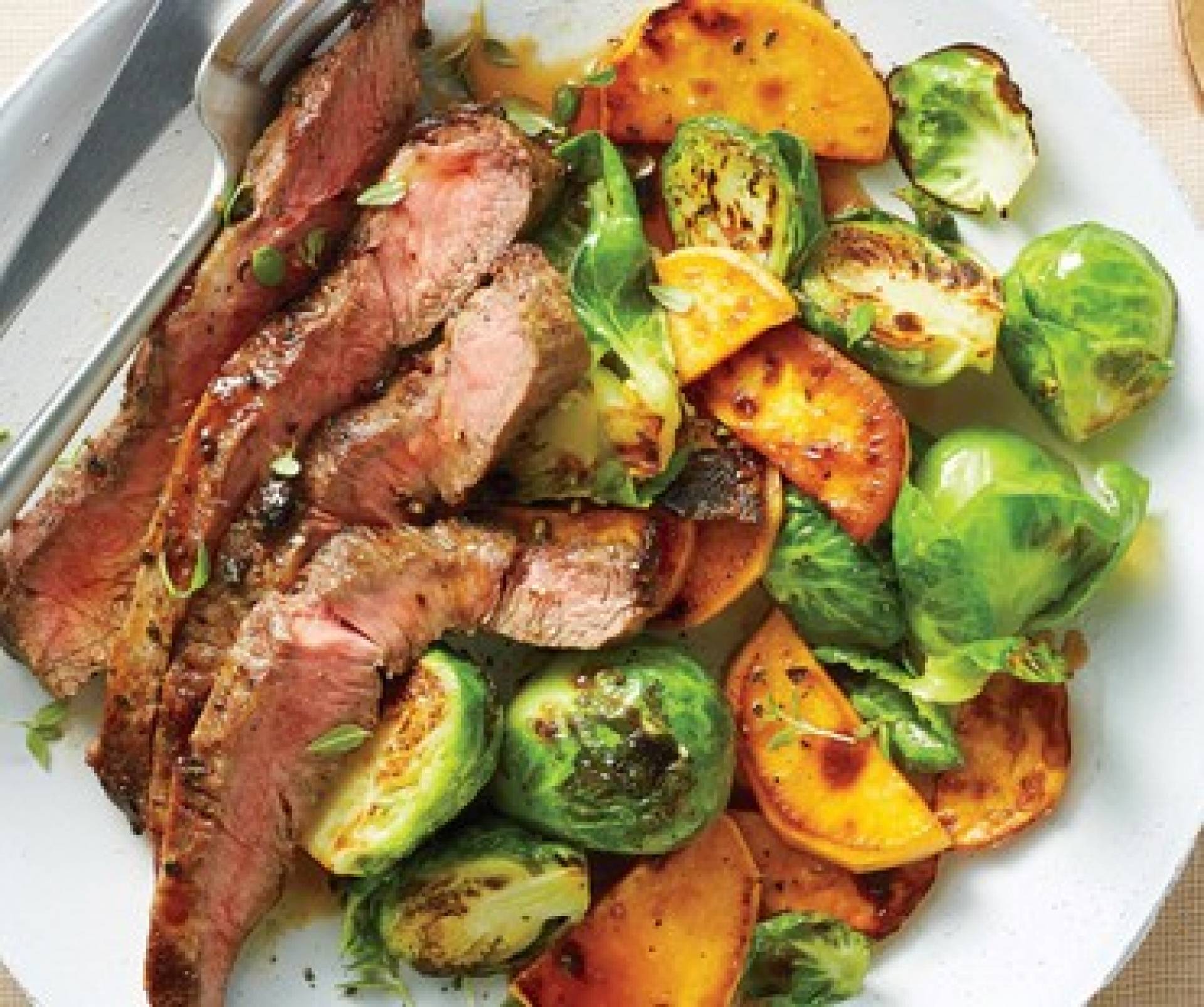 top sirloin steaks rubbed with confit garlic blended with dijon, olive oil and seasoning, served with a side of roasted potatoes, brussel sprouts and mushrooms